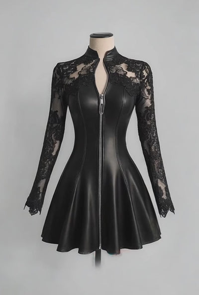 Elevate your evening look with this striking Leather Lace Patchwork Zip Mini Dress. Featuring long sleeves and a modern mix of textures, this party-ready piece combines edgy leather accents with delicate lace detailing for a sophisticated contrast. The convenient zip closure adds both style and practicality, while the mini silhouette keeps things bold and contemporary. Perfect for nights out, special events, or whenever you want to make a statement. Versatile enough to dress up or down, this dress is a wardrobe essential for fashion-forward individuals.